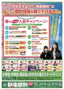 2026年度春の新入塾生募集開始 @城陽市寺田にある個別指導塾 勉楽個別 寺田小・寺田西小・寺田南小・今池小・富野小・深谷小・久世小・久津川小・古川小・城陽中・西城陽中・東城陽・北城陽中・南城陽中・南陽高・城南菱創高・莵道高・久御山高・城陽高